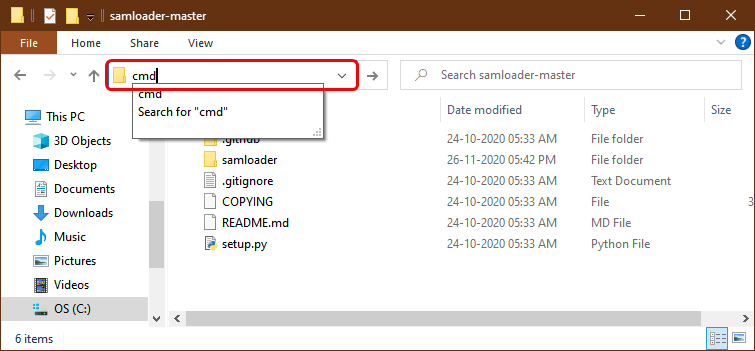 - من هنا قم باستخراج محتويات ملف master.zip الذي قمت بتحميله في الخطوة السابقة. بداخل مجلد samloader-master الناتج من فك الضغط، قم بتشغيل نافذة Windows Powershell وذلك بواسطة كتابة ”cmd“ في خانة العنوان بالأعلى مثلما يظهر بالصورة السابقة ثم اضغط Enter: